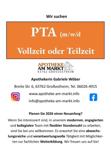 Natürlich möchten wir auch PTAs an Apotheken vermitteln und umgekehrt. Daher freut es uns besonders, dass wir hier ebenso aktuelle Stellenangebote für PTAs und Praktikumsstellen für PTA-Schüler und Schülerinnen besonders von Apotheken unserer Fördervereinsmitglieder aus Würzburg und Umgebung veröffentlichen können.